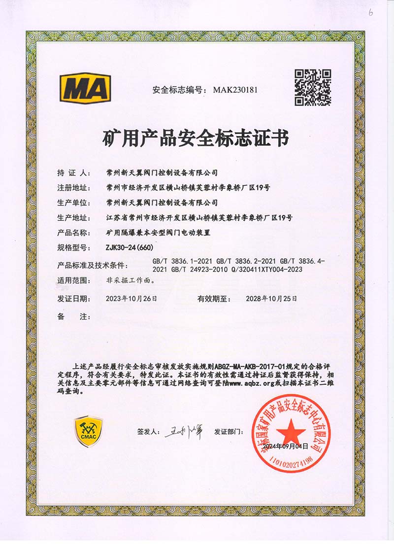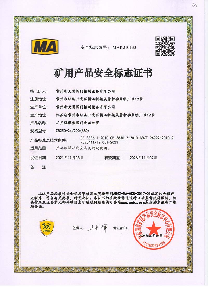 礦用隔爆ZB10-24中國國家強制性產品認證證書110.1